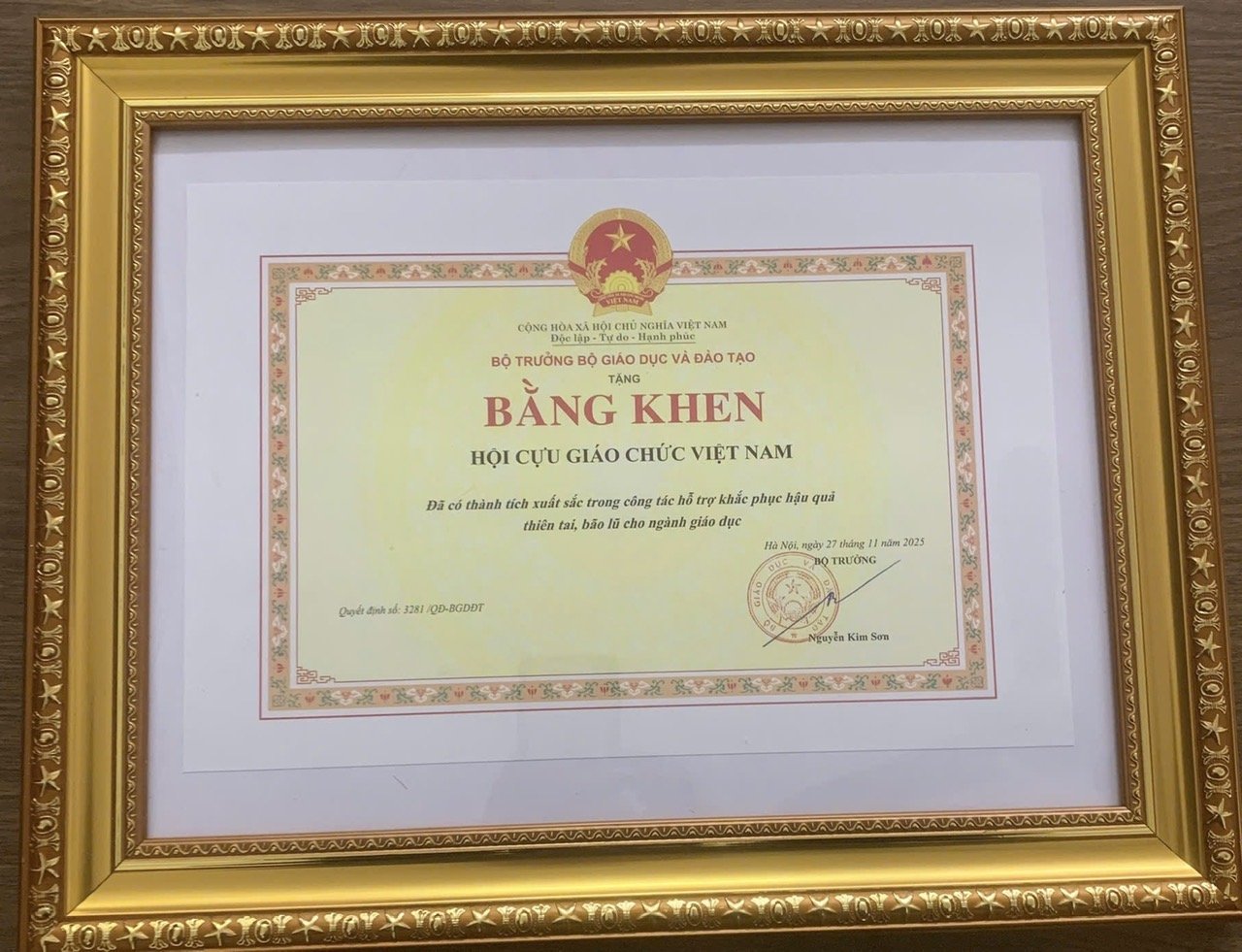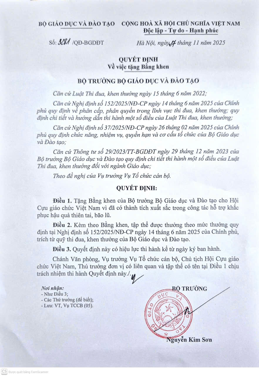 TCGCVN - Ngày 27/11/2025, Bộ trưởng Bộ Giáo dục và Đào tạo Nguyễn Kim Sơn đã ký Quyết định số 3281/QĐ-BGDĐT về việc tặng Bằng khen cho Hội Cựu giáo chức Việt Nam. Đây là phần thưởng cao quý ghi nhận những đóng góp đặc biệt xuất sắc của Hội trong hoạt động hỗ trợ đồng bào, giáo viên và nhà trường tại các địa phương chịu thiệt hại do thiên tai, bão lũ năm 2025.
