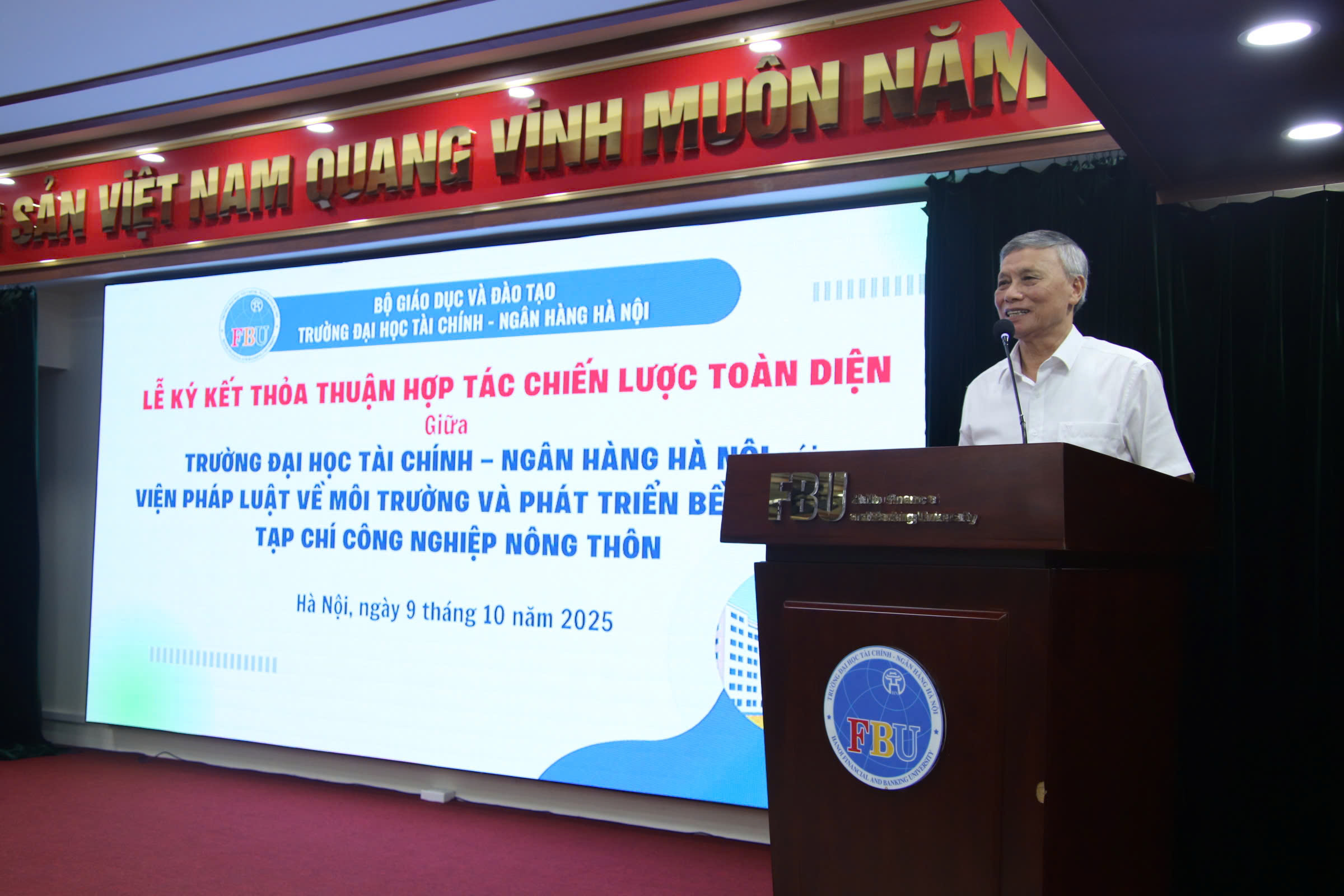 TCGCVN – Sáng 09/10/2025, tại Trường Đại học Tài chính – Ngân hàng Hà Nội đã diễn ra Lễ ký kết thỏa thuận hợp tác chiến lược toàn diện giữa Trường Đại học Tài chính – Ngân hàng Hà Nội, Viện Pháp luật về Môi trường và Phát triển bền vững và Tạp chí Công nghiệp Nông thôn.