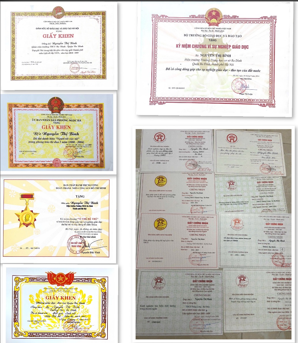 Cô Bình đã đạt các danh hiệu cao quý: Kỷ niệm chương vì sự nghiệp giáo dục do Bộ trưởng Bộ giáo dục trao tặng; Kỉ niệm chương vì thế hệ trẻ do Trung ương Đoàn trao tặng; Giáo viên dạy Giỏi cấp Thành phố đạt Giải Nhì Hội thi GV dạy Giỏi cấp Thành phố; Giải Xuất Sắc cấp quận; Đạt danh hiệu chiến sĩ thi đua; Lao động tiên tiến; Nhiều sáng kiến kinh nghiệm xếp loại cấp Thành phố; Danh hiệu gương: “Người tốt việc tốt”; Danh hiệu: “Giỏi việc trường, đảm việc nhà” và “Cô giáo người mẹ hiền” của Công đoàn giáo dục Ba Đình trao tặng; Giấy khen đã có thành tích trong phong trào Chữ thập đỏ; Đảng viên hoàn thành Xuất sắc nhiệm vụ….